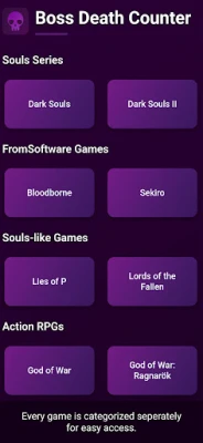 The new and revamped Boss Death Counter is an app for you to track and save your attempts with various challenging bosses from different games. Every game and every boss has their own pages so that you could seperate them easily while never giving up!